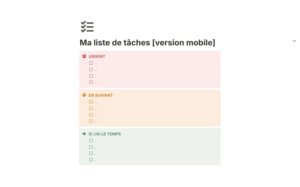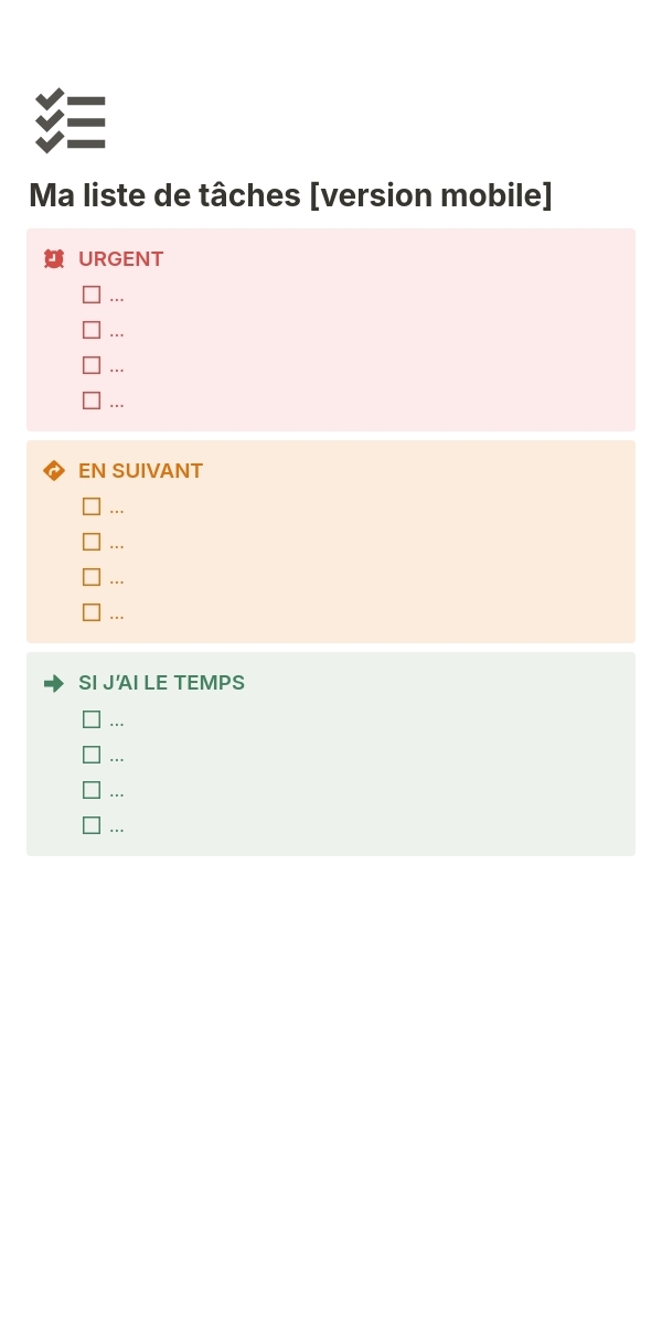 Un modèle extrêmenent simple, pensé pour l'expérience sur mobile, afin de gérer facilement votre liste de tâches du jour ou de la semaine. N'hésitez pas à l'utiliser au sein de votre système, que ça soit au sein d'un calendrier, de votre dashboard de la semaine ou du jour.